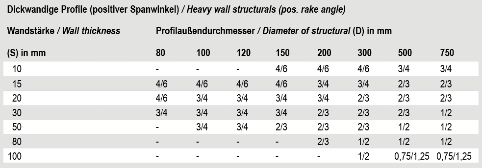 Gerade bei der Zerspanung von Profilen beeinflusst die Wahl der Verzahnung entscheidend das Sägeergebnis. Als weltweit günstigste Zahnform hat sich dabei der Einsatz von Bandsägen mit variabler Verzahnung gezeigt. Dabei richtet sich die erforderliche Zahnteilung nach Wandstärke und Durchmesser der zu zerspanenden Profile. Die folgenden Tabellen gelten für Einzelschnitte. Wenn zwei oder mehr Rechteckprofile nebeneinander zerspant werden, gelten die Tabellen unter Berücksichtigung der 2-fachen Wandstärke.